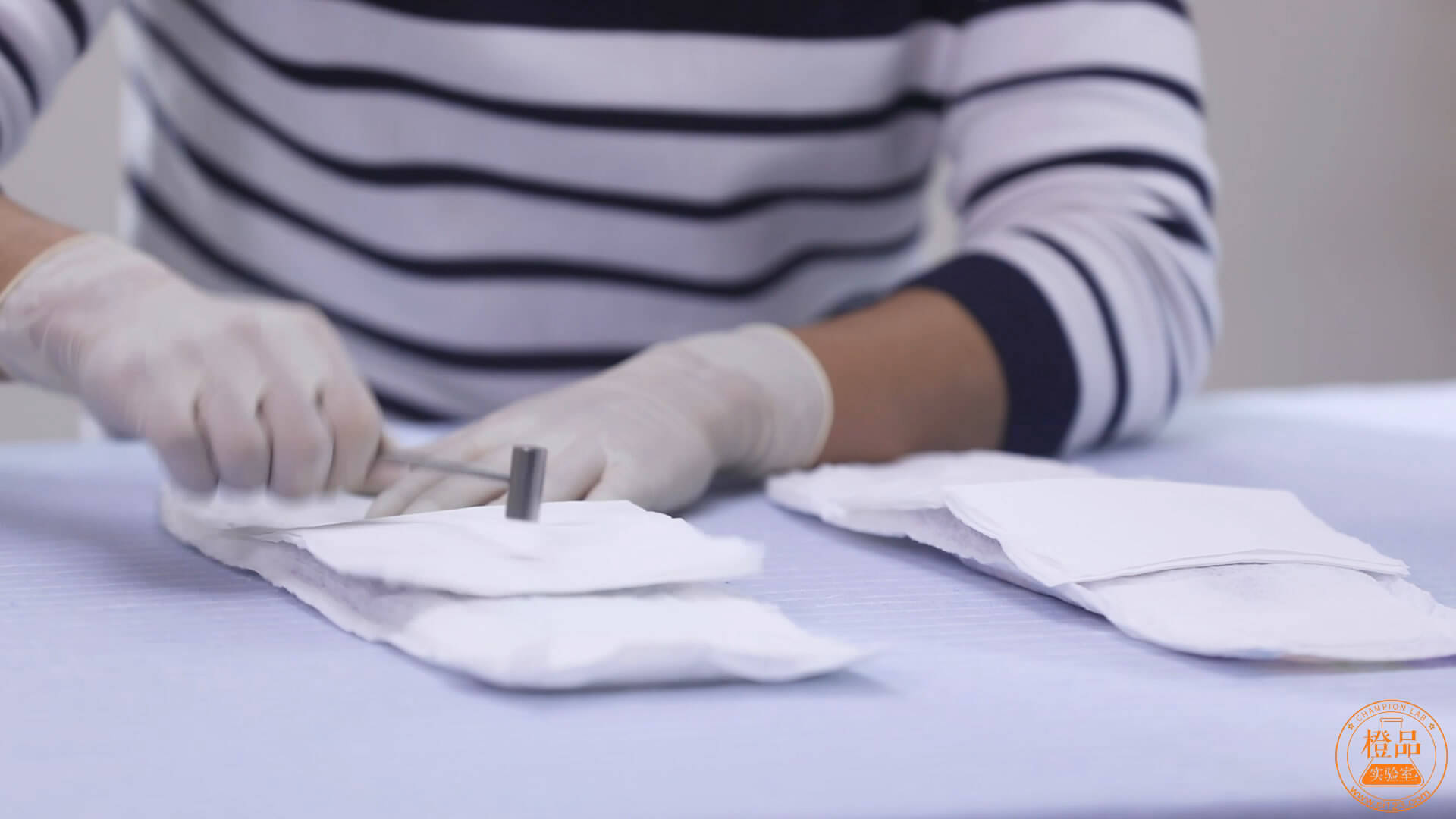 为了测试妈咪宝贝云柔干爽纸尿裤的反渗情况,我们分别取了三张面纸覆盖在纸尿裤的吸收层上,我们将用三种不同的力度来蹂躏这两款纸尿裤,观察他们的吸收性。