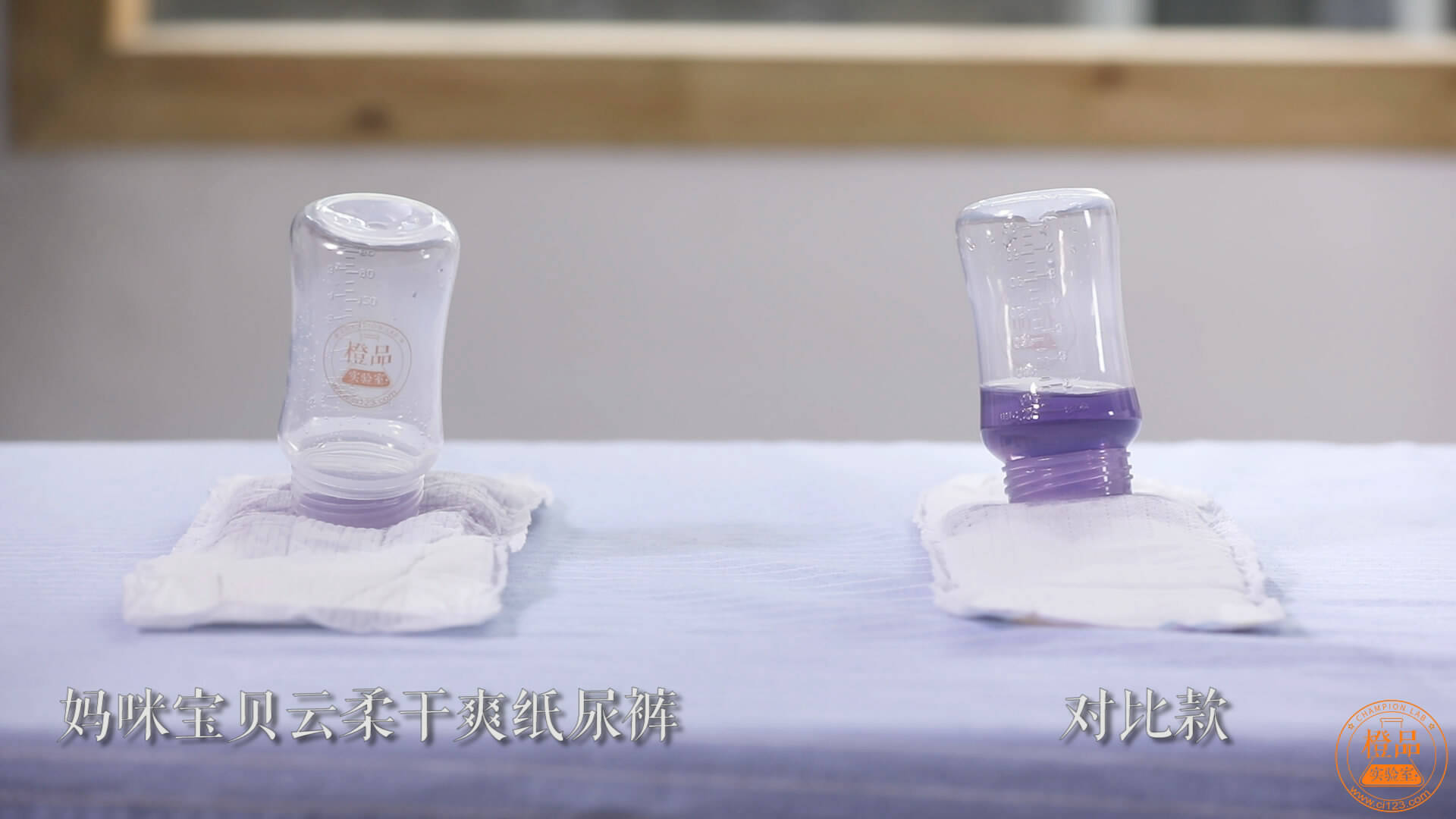 结果非常明显,画面左边的妈咪宝贝云柔干爽纸尿裤都已经吸完了,右手边的对比款容器内还有不少液体!测试得出,妈咪宝贝纸尿裤在同等情况下,比对比款快了近1.3倍!加分!